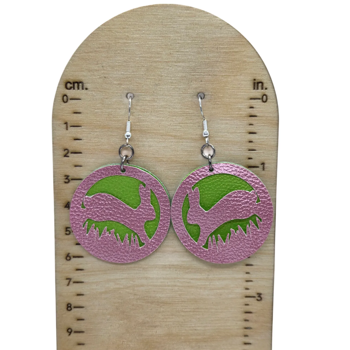 Aren't these adorable? Cute little bunnies frolicking in the grass. And, they're super lightweight! Available silver plated ear wires. Earrings come with plastic ear nuts. Back side is green, as shown in the second photo. Earrings measure 2.25" long with a 1.5" drop, and are 1.5" wide. 1 pair
